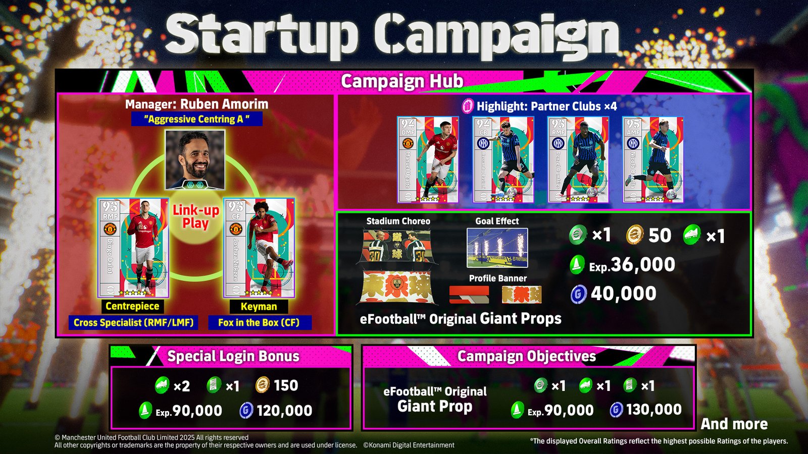 Oyunseverler, çeşitli oyun içi kampanyalar aracılığıyla yeni futbolcularla sözleşme imzalamak için kullanılabilecekleri eFootball™ coin’leri, futbolcu gelişimi için eğitim öğeleri, EXP ve GP gibi oyun içi ödüllerin yanı sıra Kampanya Merkezi, Özel Giriş Bonusları ve Kampanya Başarıları gibi ödüller kazanabilirler.